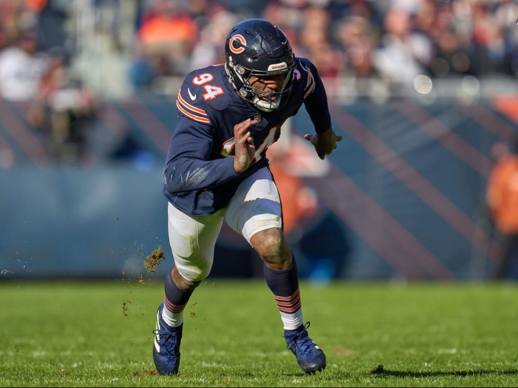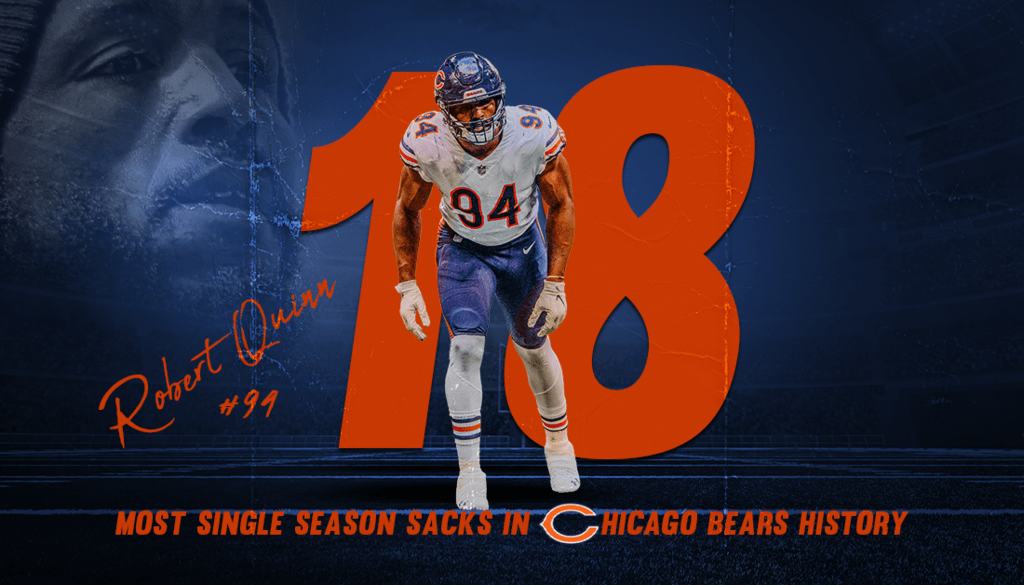 - OLB #94 Robert Quinn – 48 tackles, 17 TFL’s, 18 sacks!, 4 forced fumbles. After looking horrible in 2020, Quinn put it all together and dominated in ’21. You’ve gotta give Quinn a ton of credit for working hard, doing it quietly, and putting up giant numbers despite the fact Khalil Mack was out most of the season with an injury, thus opening up opponents to double team Quinn. Whether they did or not, it never worked consistently. Quinn hounded QB’s all year. He broke an old Bears franchise record by recording 18 sacks which broke Richard Dent’s record of 17.5 sacks in 1984. Congratulations to our Bears Player of the Year!